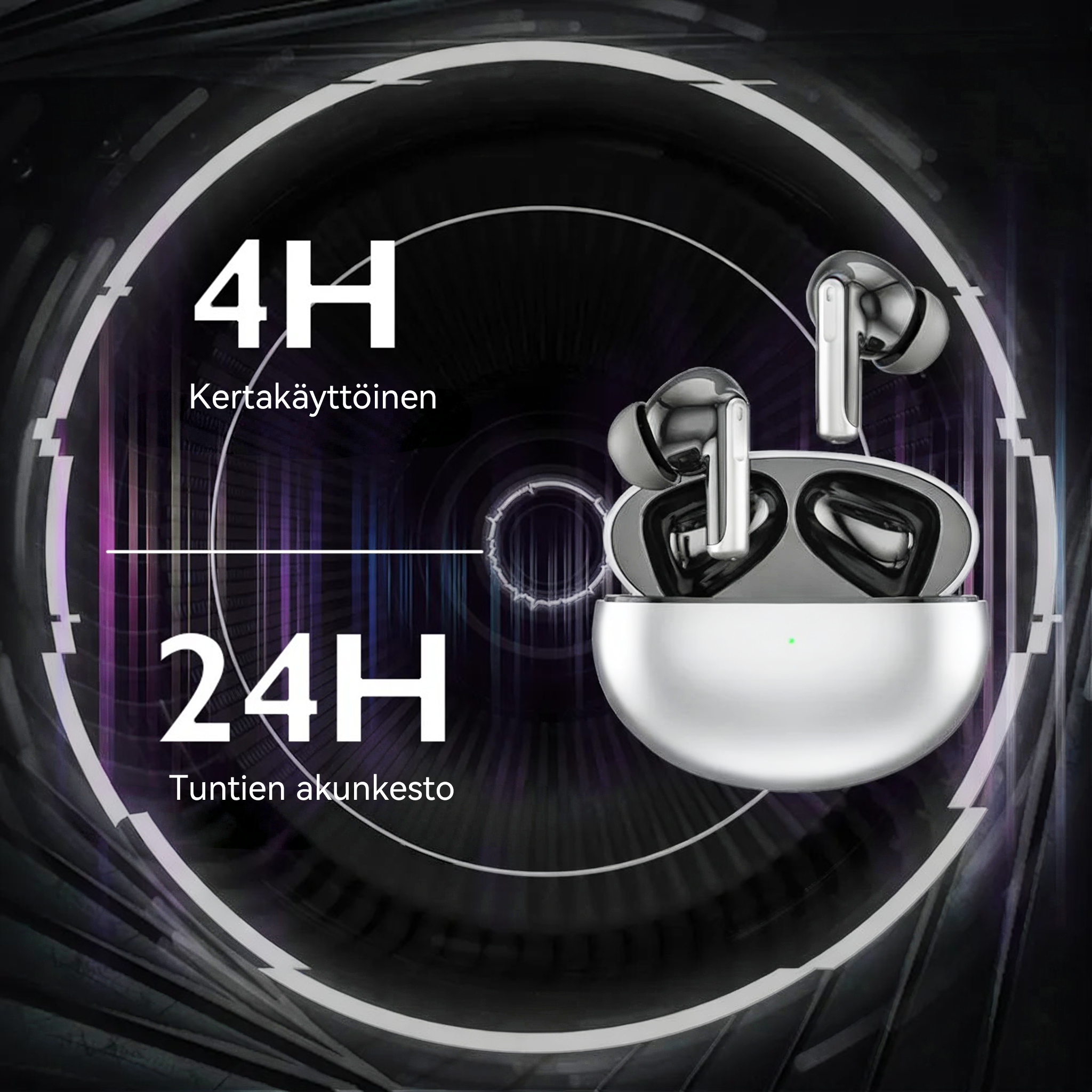 - Jopa 8 tuntia kuunteluaikaa (jopa 24 tuntia latauskotelon kanssa).